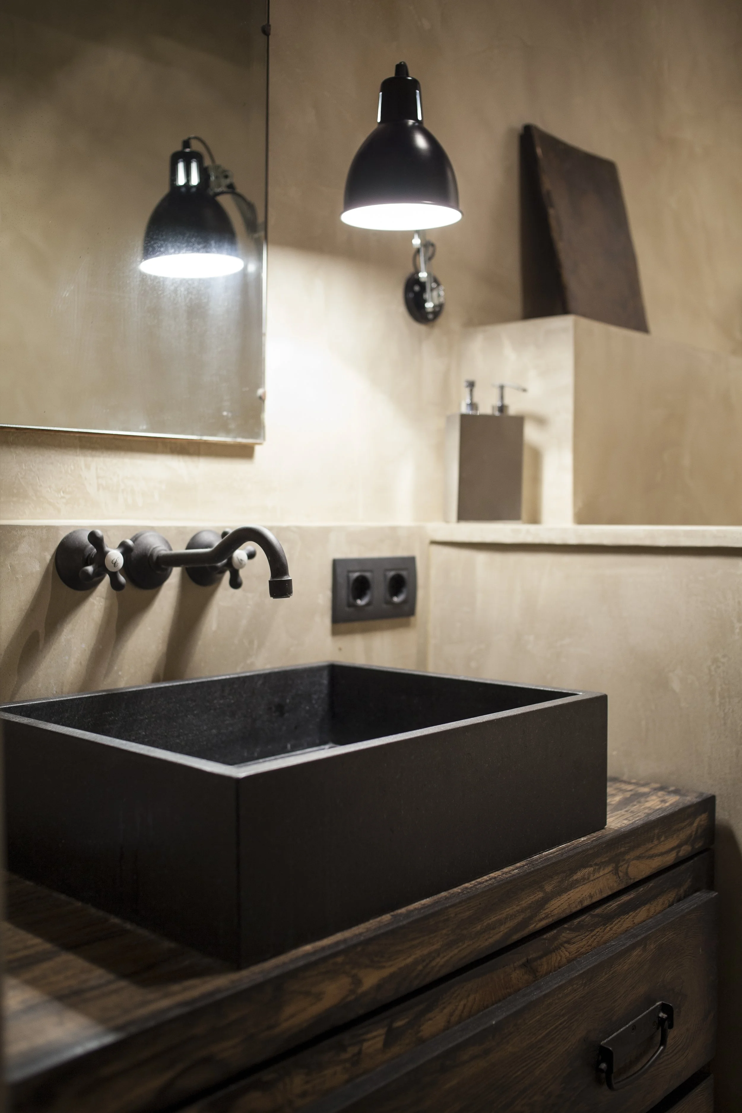 Para lograr este aspecto refinado y sofisticado, diseñamos una pica a medida en granito natural, que se integra perfectamente con la grifería empotrada de la firma Rovira, aportando un toque vintage y elegante al baño.