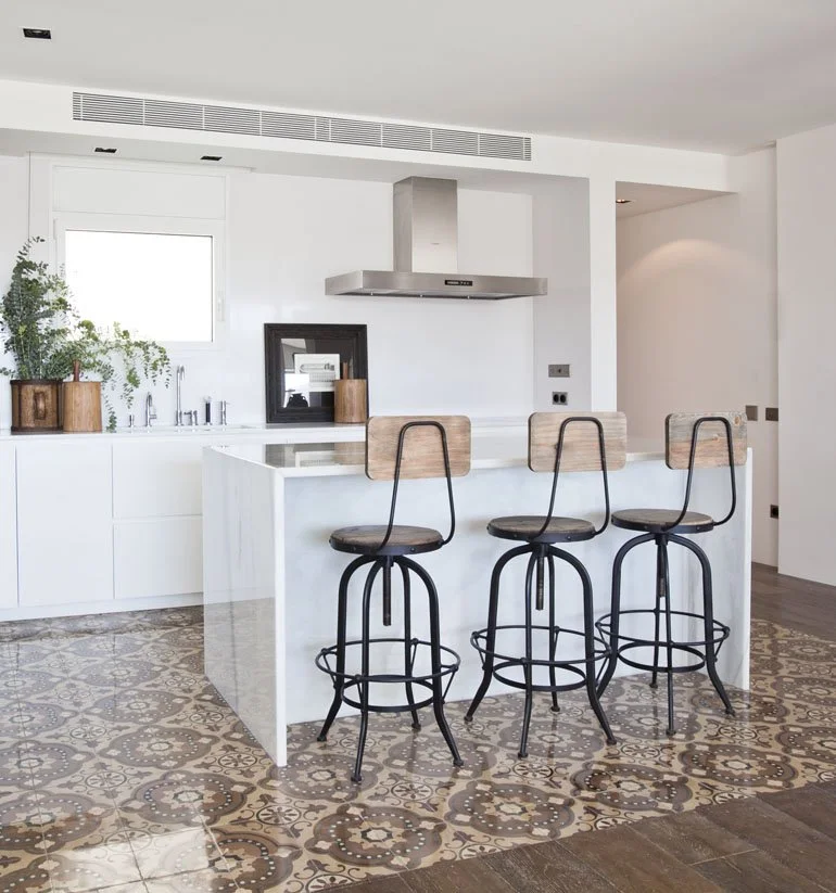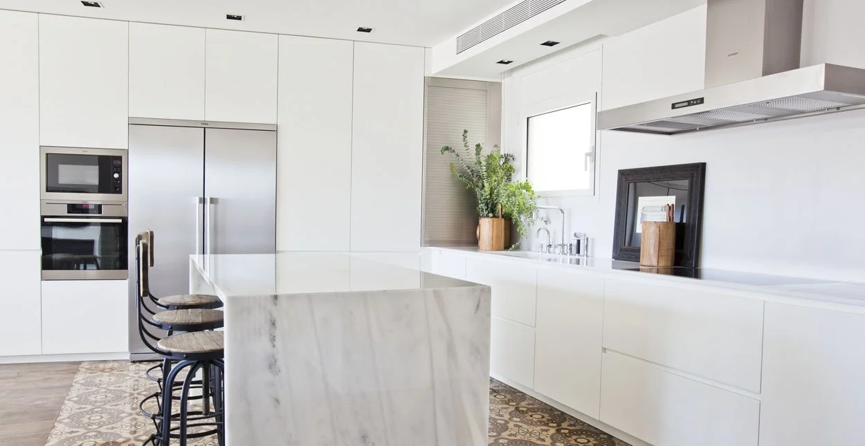 Optamos por un diseño de puertas ocultas, integrándolas perfectamente en las paredes para lograr una estética limpia y uniforme. Además, abrimos la cocina al salón, maximizando la entrada de luz natural y creando un ambiente más amplio y conectado.