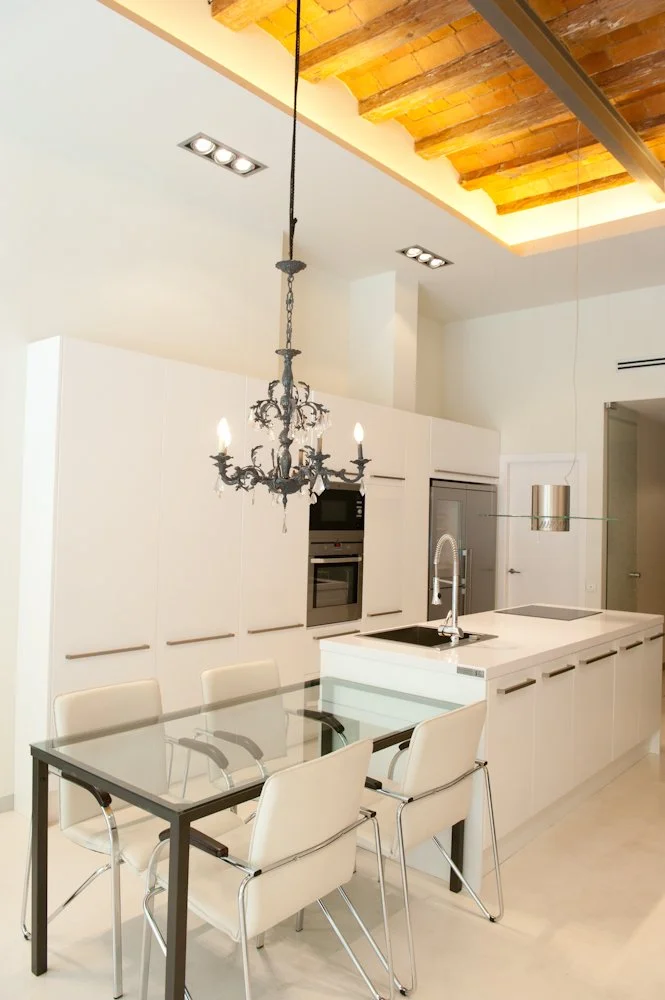 En este proyecto, decidimos abrir por completo la cocina al salón, recuperando la preciosa bóveda catalana del techo, un elemento tan característico de los pisos del Ensanche Barcelonés.
